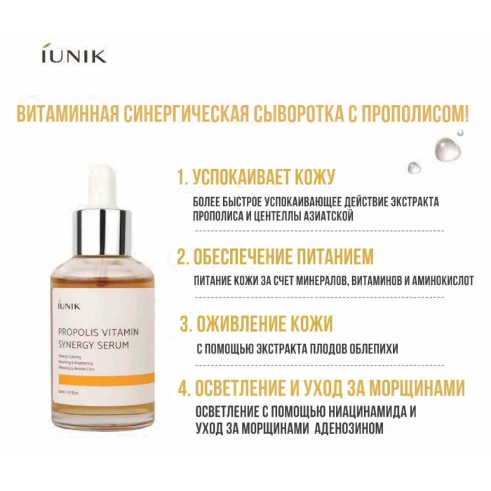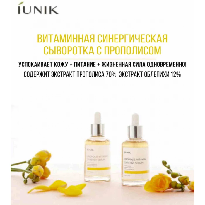 Витаминная сыворотка с прополисом iUnik Propolis Vitamin Synergy Serum улучшает общий цвет лица и оздоравливает. Мягко осветляет пигментацию и выравнивает тон кожи, прополис оказывает обеззараживающее действие, ускоряет заживление акне и воспаления. Питает и поддерживает тонус кожи.