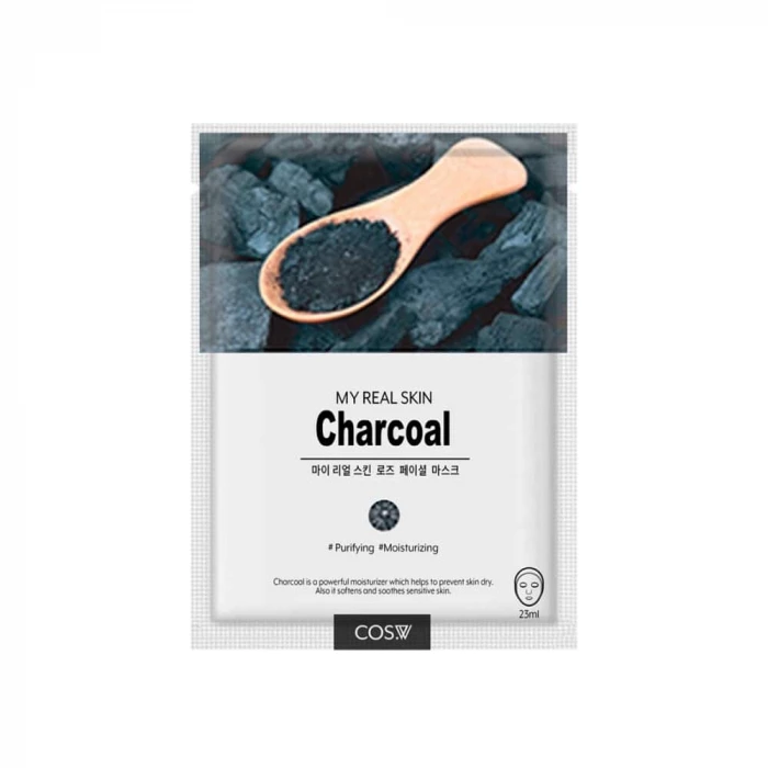 Тканевая маска для лица с древесным углем COS.W My Real Skin Charcoal Facial Mask увлажняет, детоксицирует, абсорбирует излишки себума, мягко отшелушивает ороговевшие клетки, способствует очищению пор, благодаря чему они выглядят уже, а микрорельеф более ровным и гладким.